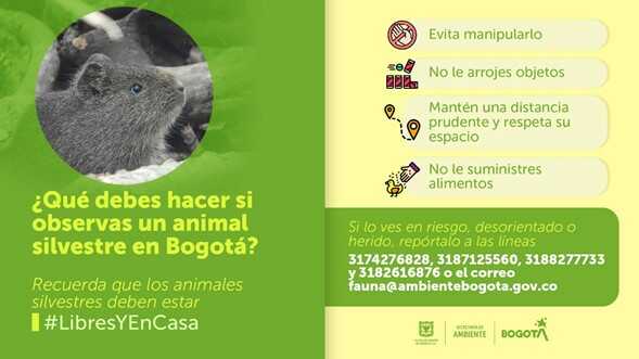 - A través de las líneas telefónicas 3174276828, 3187125560, 3188277733 y 3182616876 o el correo fauna@ambientebogota.gov.co se pueden reportar los casos de riesgo o tráfico de animales silvestres en la ciudad.