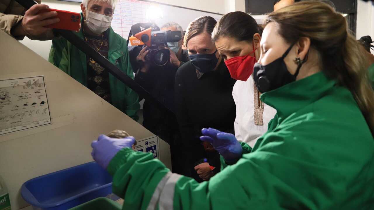La secretaría de Ambiente, Carolina Urrutia (centro); la concejal de Bogotá, Andrea Padilla (camisa blanca); la directora del Idpyba, Adriana Estrada (esquina superior izquierda), Catalina González (derecha), bióloga de la Secretaría de Ambiente en la revisión y verificación de los animales incautados. Foto: Comunicaciones.