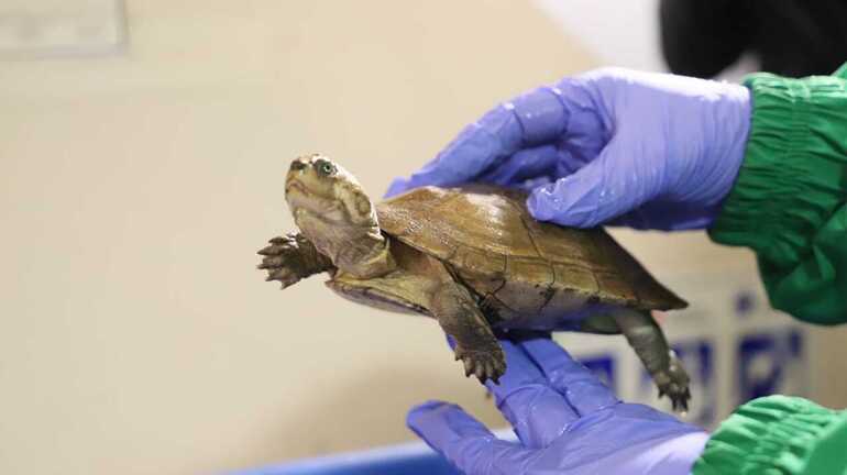 Los animales eran transportados en un recipiente plástico y en precarias condiciones de salubridad. Uno de los individuos, de edad adulta, presentaba erosiones en el caparazón debido a las condiciones de mantenimiento.