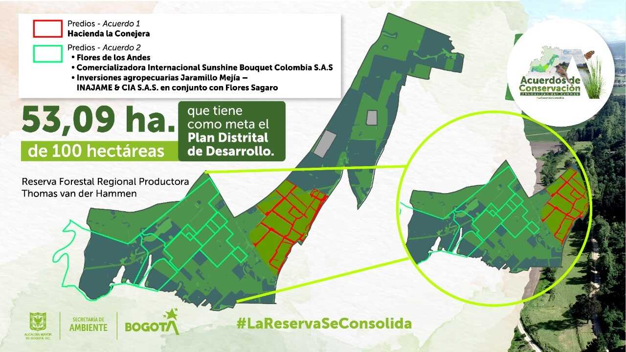 "Como hemos mencionado, los acuerdos de conservación son una herramienta para trabajar con los propietarios de suelo en la reserva forestal regional productora Thomas van der Hammen, que tiene más de 1300 hectáreas para poder mejorar la sostenibilidad de los sistemas productivos en esta reserva, que es productora, y para también tener conectividad ecológica que efectivamente sirva para cumplir con la función natural que tiene, que es conectar los Cerros con el río Bogotá y con toda la sabana de Bogotá para mejorar nuestros servicios ecosistémicos y las condiciones y biodiversidad", indicó la secretaria de Ambiente, Carolina Urrutia.