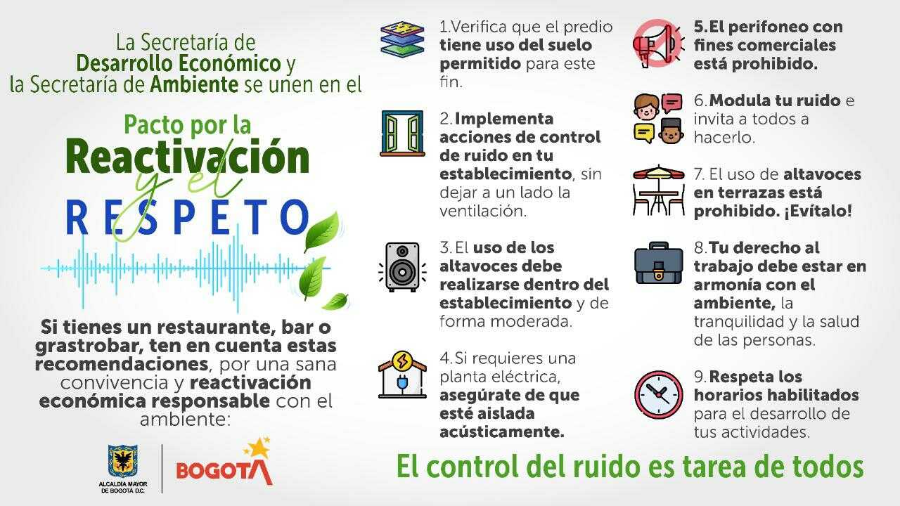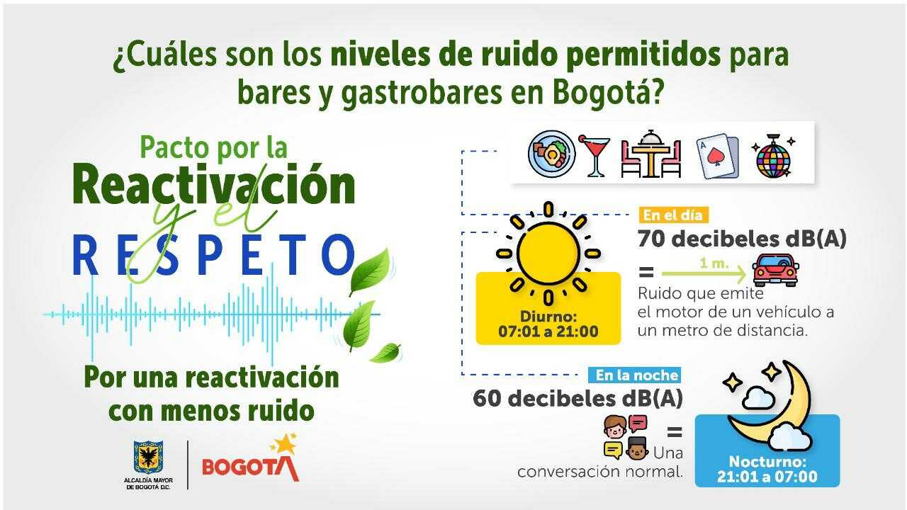 - Las secretarías de Ambiente y Desarrollo Económico hicieron una invitación formal a los propietarios y administradores de bares, gastrobares y restaurantes para que en su reapertura respeten y moderen los límites permitidos de ruido y se vele por una sana convivencia.