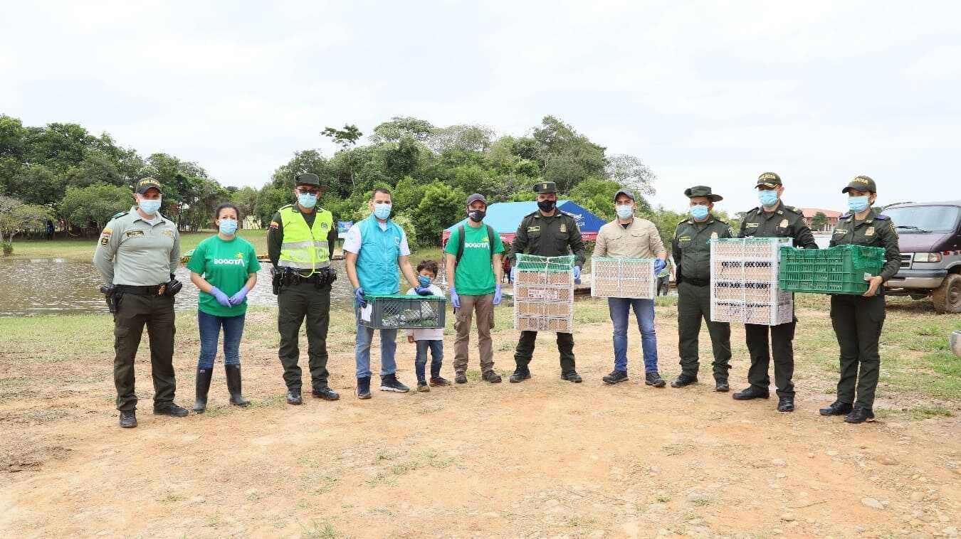En la jornada fueron liberadas 1917 tortugas matamata que habían sido incautadas a finales de abril en un operativo de la Secretaría de Ambiente y la Policía Ambiental y Ecológica en la terminal de carga del aeropuerto El Dorado.
