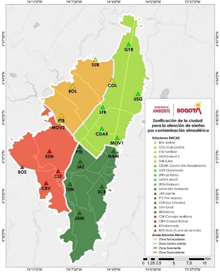 Las alertas por calidad del aire se pueden declarar en toda la ciudad o en zonas afectadas por contaminación (zona noroccidente, centro oriente, suroriente y suroccidente).