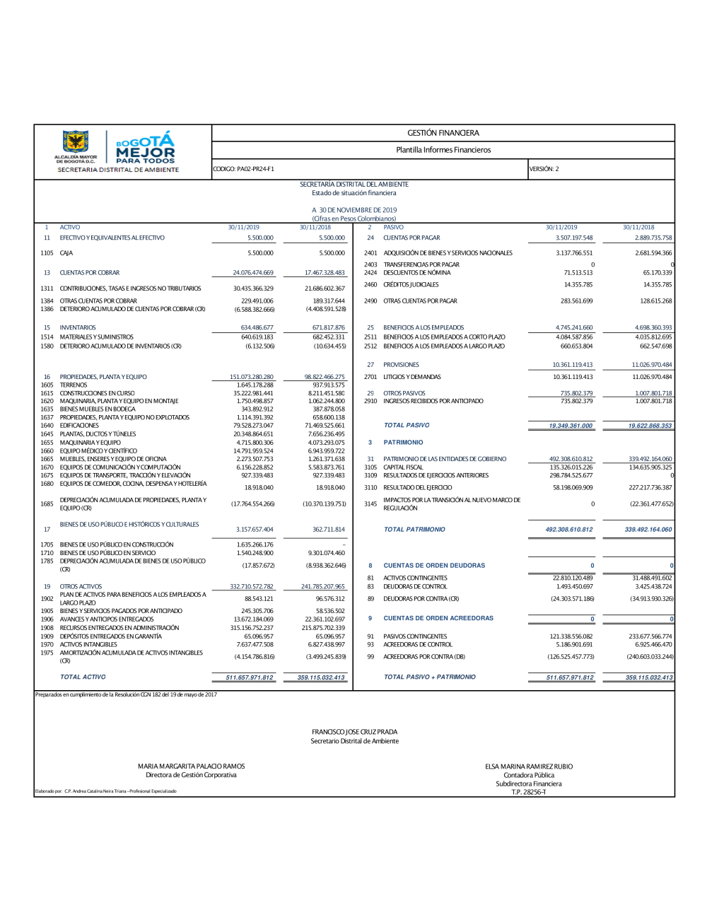La Secretaría Distrital de Ambiente está sujeta al Marco Normativo para Entidades de Gobierno adoptado por la Resolución 533 de 2015 de la Contaduría General de la Nación (CGN). En cumplimiento de lo establecido en el numeral 37 del artículo 38 de la Ley 1952 de 2019, y conforme al procedimiento para la preparación y publicación de los informes financieros y contables determinado por la CGN, se prepararon los siguientes Informes Financieros y Contables: