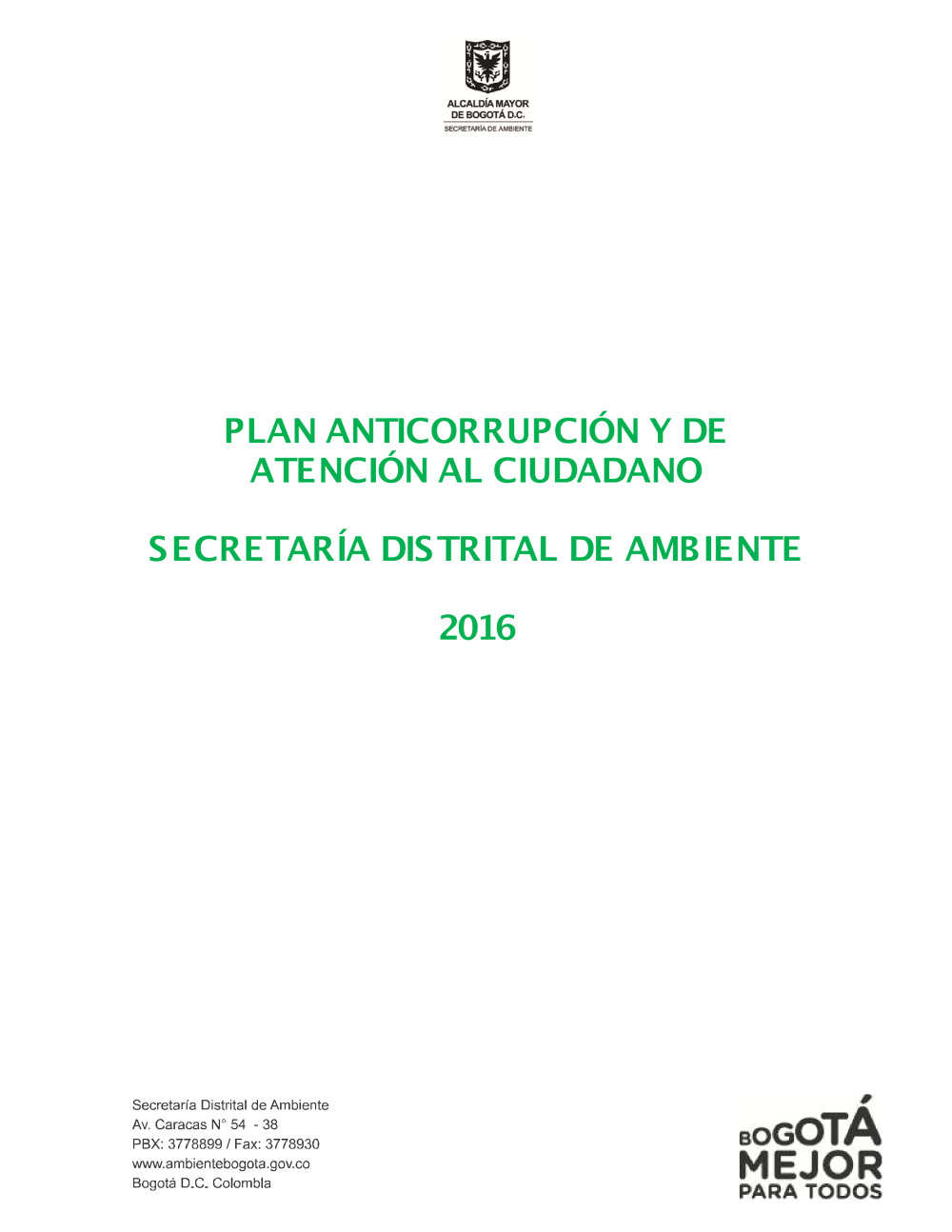 Dicho plan tiene por objetivo fijar estrategias institucionales, encaminadas a la lucha contra la corrupción y el acceso a la información pública y transparente, que permitan prevenir, controlar y mitigar el riesgo de corrupción y a su vez posibiliten el fácil acceso a los trámites y servicios de la entidad y la generación de espacios de participación y diálogo con la ciudadanía, a fin de mejorar la eficiencia administrativa y la optimización de recursos, construyendo colectivamente principios y valores de integrida en los servidores públicos y, orientando la prestación del servicio que se entrega a la ciudadanía con mejores prácticas, en cumplimiento de la misión de la Secretaría Distrital de Ambiente.
