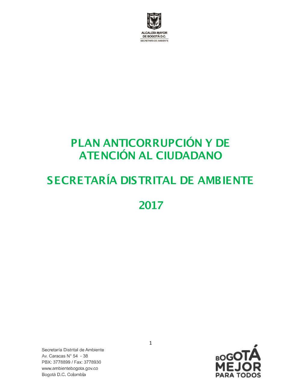Dicho plan tiene por objetivo fijar estrategias institucionales, encaminadas a la lucha contra la corrupción y el acceso a la información pública y transparente, que permitan prevenir, controlar y mitigar el riesgo de corrupción y a su vez posibiliten el fácil acceso a los trámites y servicios de la entidad y la generación de espacios de participación y diálogo con la ciudadanía, a fin de mejorar la eficiencia administrativa y la optimización de recursos, construyendo colectivamente principios y valores de integrida en los servidores públicos y, orientando la prestación del servicio que se entrega a la ciudadanía con mejores prácticas, en cumplimiento de la misión de la Secretaría Distrital de Ambiente.