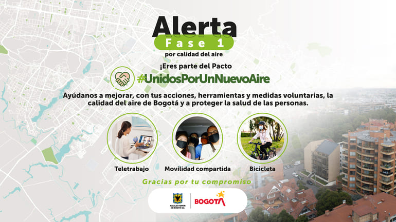 La Administración distrital agradece a los diferentes sectores que se han unido con las medidas voluntarias para mitigar los problemas de concentración atmosférica y que llevaron a decretar la Alerta Fase 1 en toda la ciudad, especialmente a Corabastos, Colfecar, Defencarga, Andemos y a las más de 80 empresas, organizaciones y colectivos que están en el pacto #UnidosPorUnNuevoAire y que con sus acciones generan un impacto positivo en la calidad del aire.