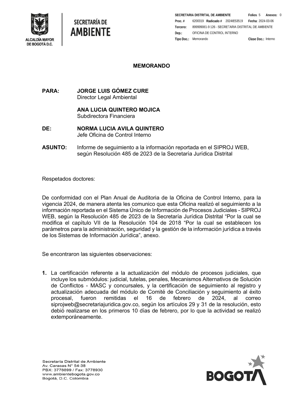 11. Informe de seguimiento a la información reportada en el SIPROJ WEB- Res. 485 de 2023 de Secretaria Jurídica Distrital y anexo...pdf