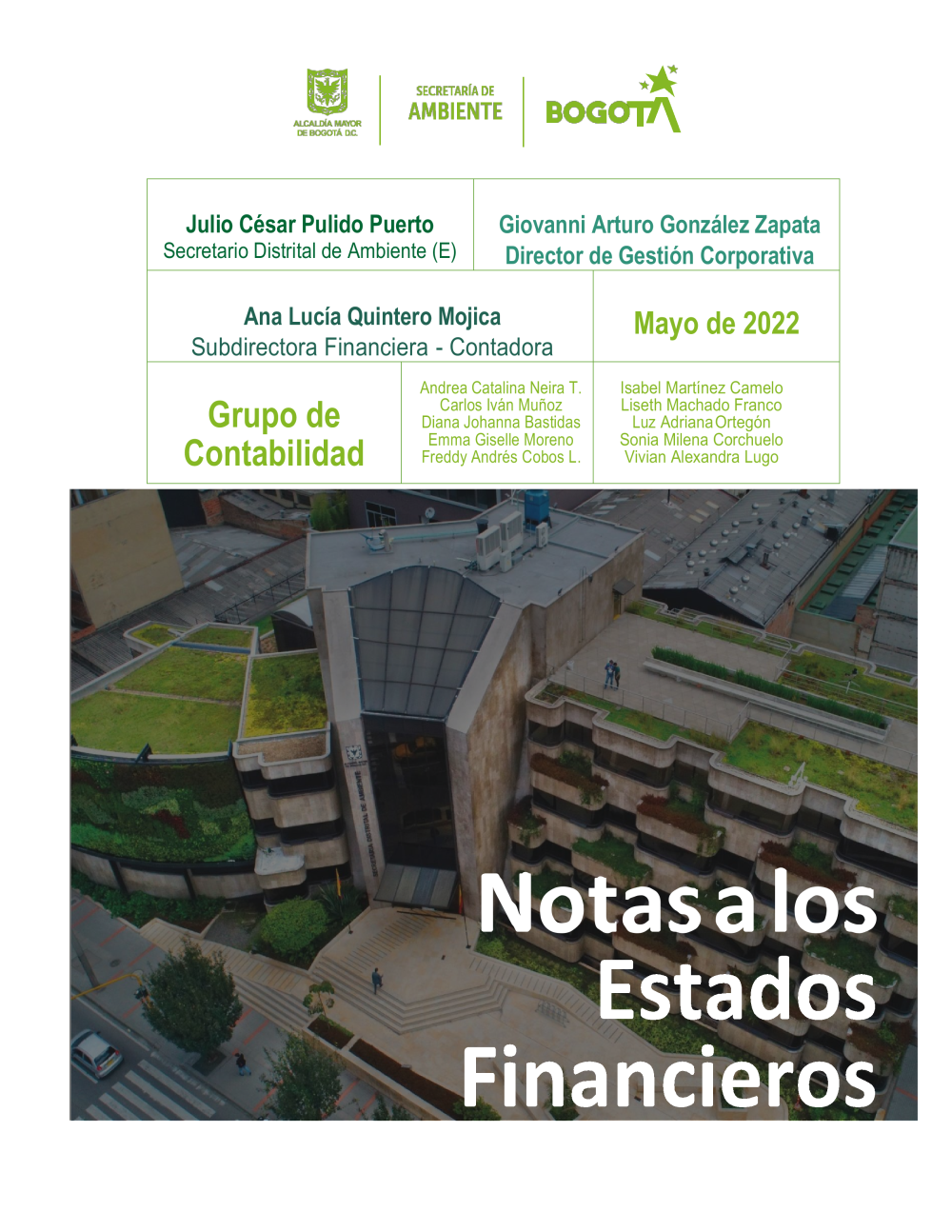 La Secretaría Distrital de Ambiente está sujeta al Marco Normativo para Entidades de Gobierno adoptado por la Resolución 533 de 2015 de la Contaduría General de la Nación (CGN). En cumplimiento de lo establecido en el numeral 37 del artículo 38 de la Ley 1952 de 2019, y conforme al procedimiento para la preparación y publicación de los informes financieros y contables determinado por la CGN, se prepararon los siguientes Informes Financieros y Contables: