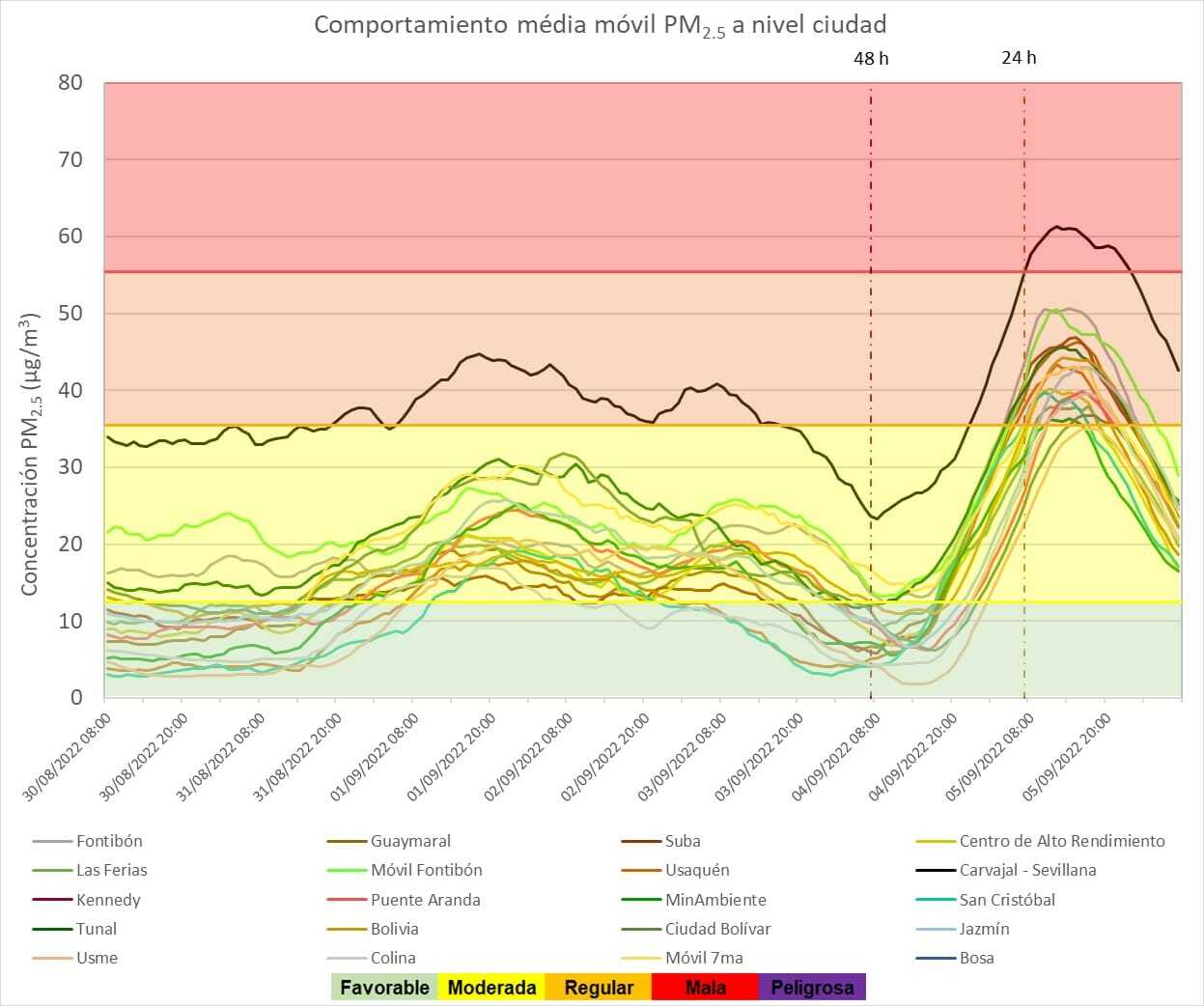 La reducción de concentración que se está presentando hoy en Bogotá se debe al cambio de vientos locales, lo que ocasiona que el material particulado no entre con tanta fuerza a la ciudad. De igual manera, el Grupo de Modelación Atmosférica de la Secretaría de Ambiente ha logrado establecer que el próximo viernes la dirección del viento puede cambiar su dirección al sur, regresando así la nube de material particulado hacia la Amazonía.
