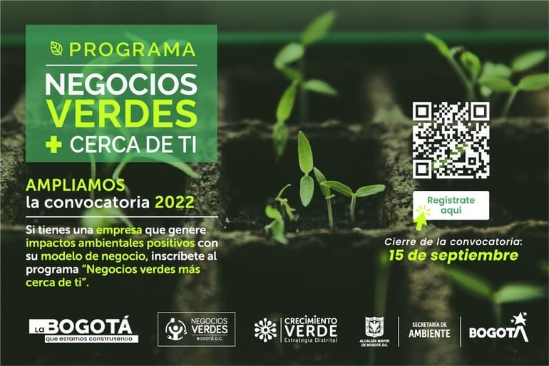 Bogotá, 31 de agosto de 2022. (@AmbienteBogota). La Secretaría de Ambiente amplió la convocatoria para que todas las empresas que generen impactos ambientales positivos con sus modelos de negocios participen en el programa ¨Negocios verdes más cerca de ti¨ y puedan fortalecer sus estrategias y aumentar las ventas.