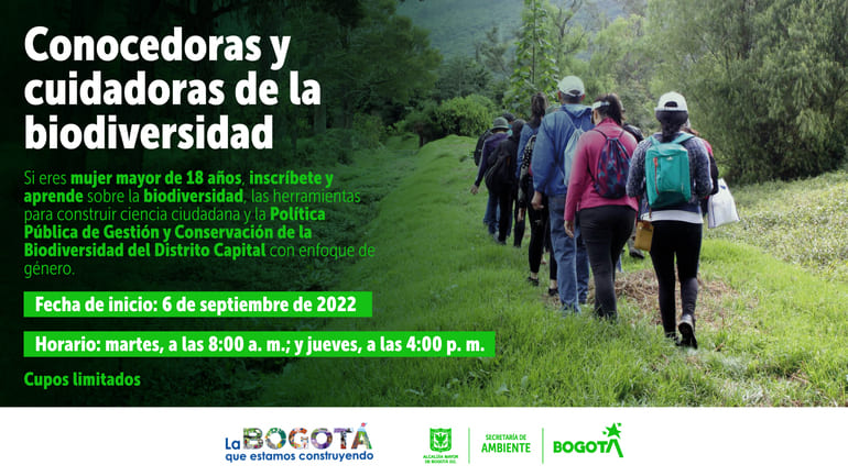 Bogotá, 02 de septiembre de 2022. (@AmbienteBogota). La Secretaría de Ambiente abrió las inscripciones para el proceso de formación ¨Conocedoras y cuidadoras de la biodiversidad¨, dirigido a mujeres mayores de 18 años.