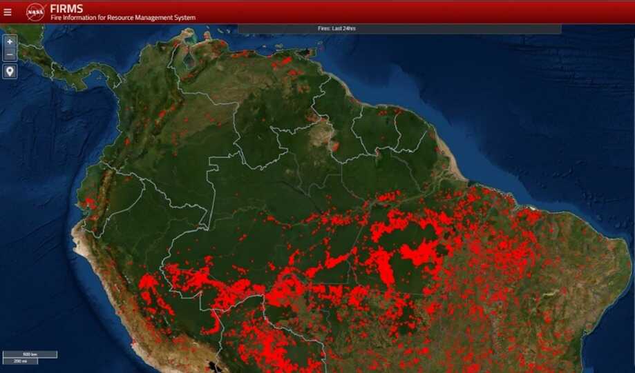 Imagen satelital donde se pueden observar los puntos calientes en Brasil. Foto tomada de https://firms.modaps.eosdis.nasa.gov/map/#d:24hrs;@-54.1,-2.6,5z
