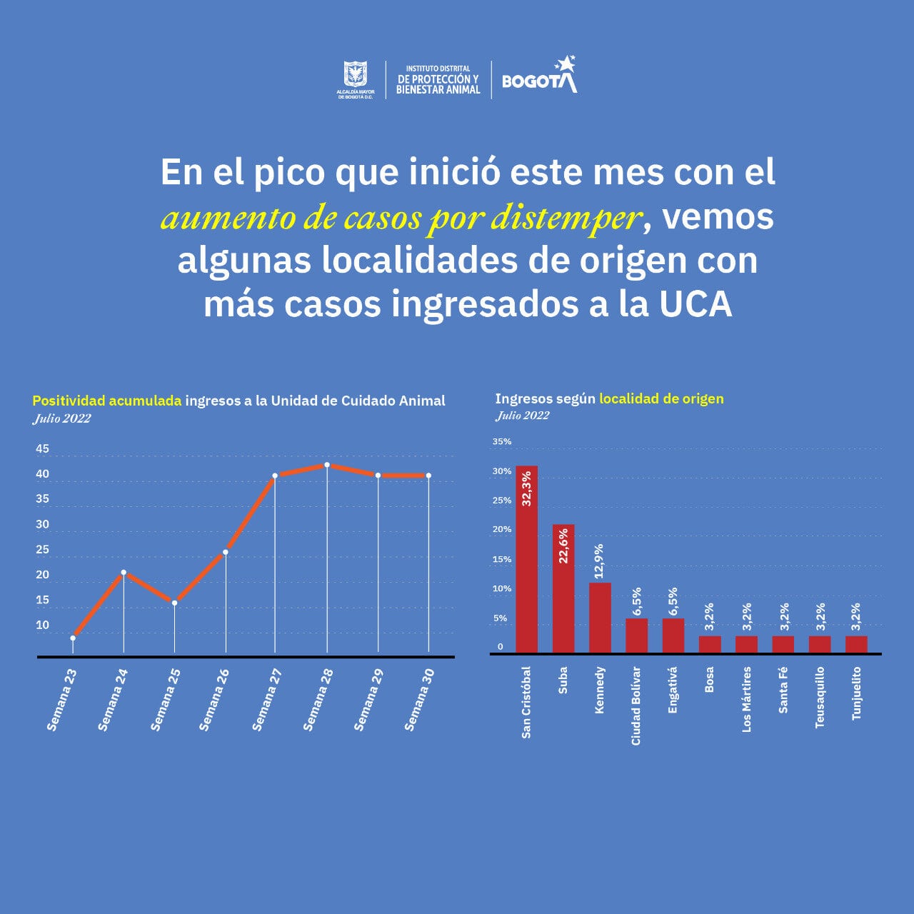 En lo que se ha evidenciado durante este pico en el mes de julio, la Unidad de Cuidado Animal (UCA) ha presentado entre un 40 y 42% de positividad a distemper canino en sus ingresos a través de los diferentes programas de atención. Las localidades de origen con más casos que han ingresado han sido San Cristóbal, Suba, Kennedy, Ciudad Bolívar, Engativá, Bosa, Los Mártires, Santa Fe, Teusaquillo y Tunjuelito.