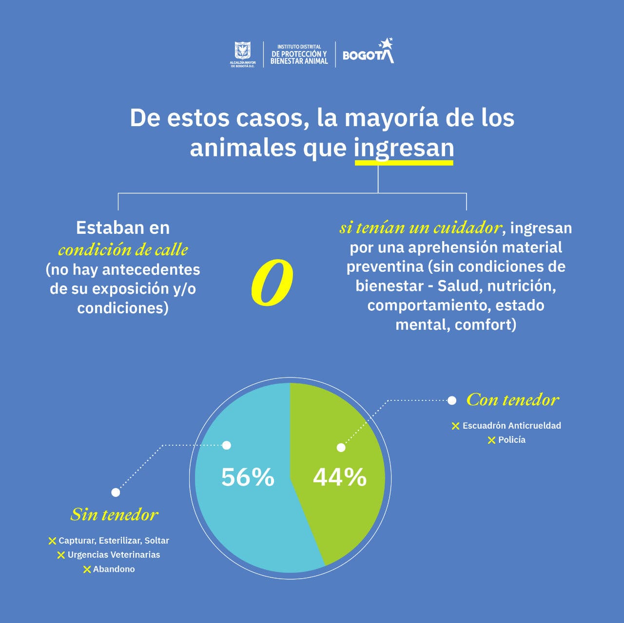 De los animales que han ingresado, el 56% eran animales sin tenedor, a través de los programas Urgencias Veterinarias, CES (Captura, esteriliza y suelta), abandono, entre otros; de los cuales se desconocen sus antecedentes (exposición a virales o historia clínica). El 44% restante proviene de animales que, si bien podían tener un cuidador, fueron ingresados por aprehensión material preventiva en la mayoría de los casos, en donde no tenían condiciones de bienestar garantizadas.