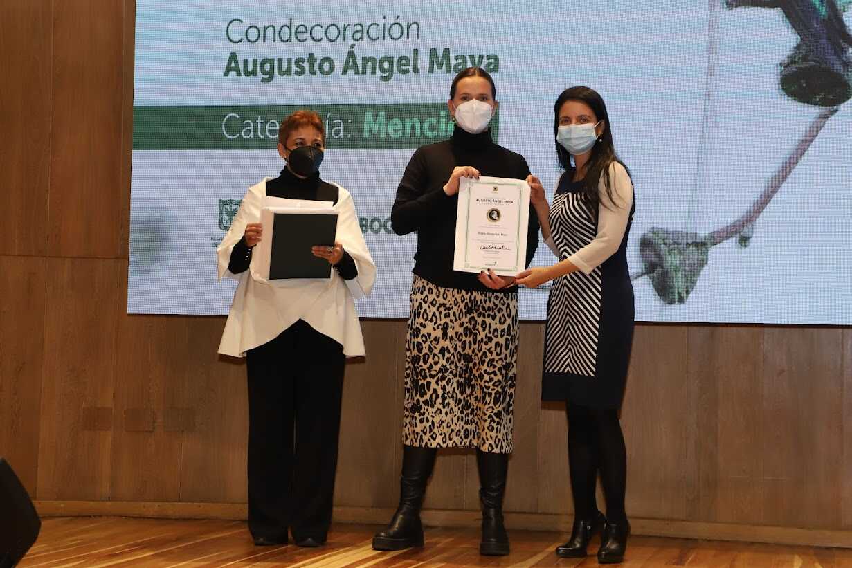 Bogotá, 26 de enero de 2022. (@AmbienteBogota). Por sus valiosos aportes a la promoción del reconocimiento y cuidado del territorio y la biodiversidad, docentes, líderes, artistas, organizaciones, entidades públicas y empresas ubicadas en Bogotá recibieron la condecoración Augusto Ángel Maya, en el marco de la celebración del Día Mundial de la Educación Ambiental.