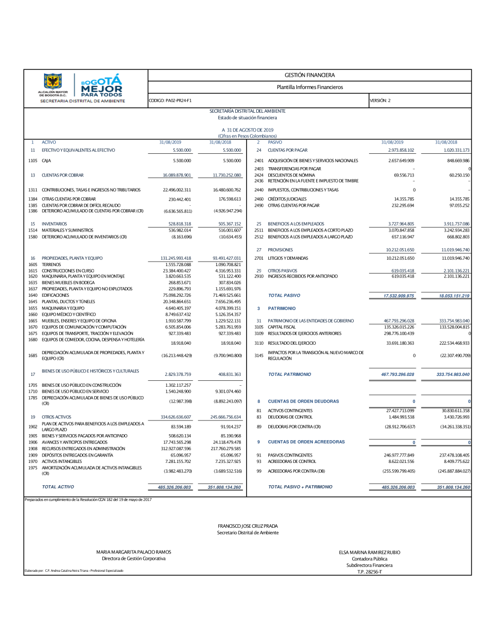 La Secretaría Distrital de Ambiente está sujeta al Marco Normativo para Entidades de Gobierno adoptado por la Resolución 533 de 2015 de la Contaduría General de la Nación (CGN). En cumplimiento de lo establecido en el numeral 37 del artículo 38 de la Ley 1952 de 2019, y conforme al procedimiento para la preparación y publicación de los informes financieros y contables determinado por la CGN, se prepararon los siguientes Informes Financieros y Contables: