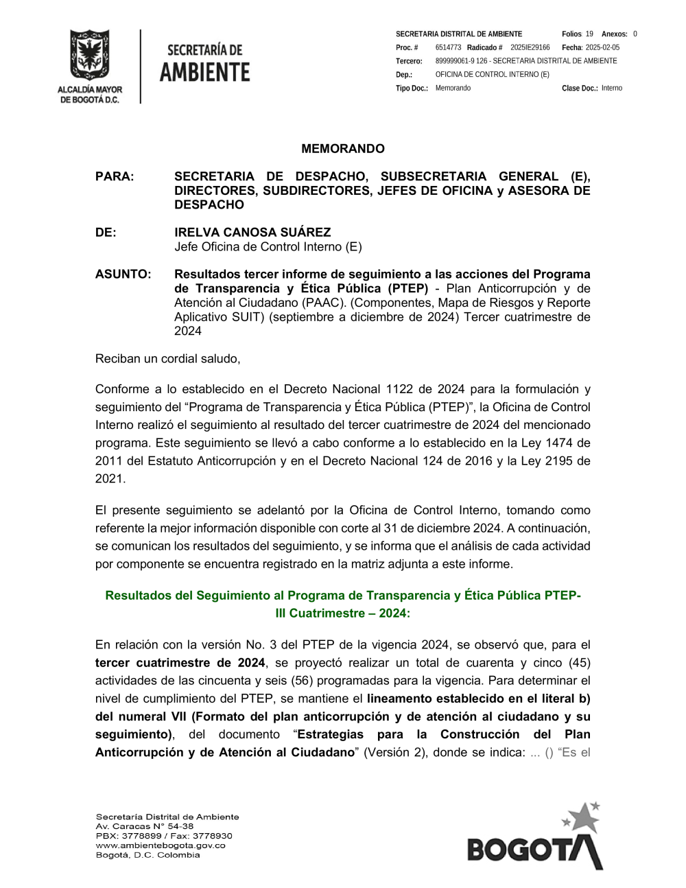 El Plan Anticorrupción y de Atención al Ciudadano será revisado y actualizado anualmente de acuerdo a los resultados de su seguimiento y evaluación. Este plan tiene tres seguimientos cuatrimestrales al año, a cargo de la Oficina de Control Interno como tercera línea de defensa según lo establecido por la norma y, cuatro seguimientos trimestrales al año, realizados por la segunda línea de defensa de la entidad conforme al esquema de lineas de defensa de la SDA; y en esta página podrá consultarlo: https://ambientebogota.gov.co/es/web/transparencia/informes-de-la-oficina-de-control-interno/-/document_library_display/dQE7lgXxsm6s/view/3153077
