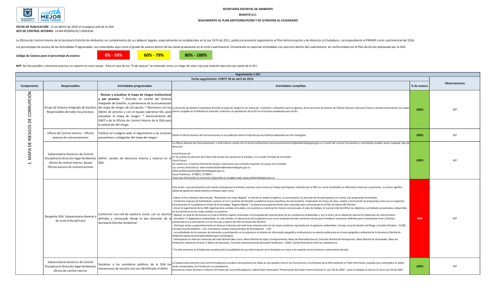 El Plan Anticorrupción y de Atención al Ciudadano será revisado y actualizado anualmente de acuerdo a los resultados de su seguimiento y evaluación. Este plan tiene tres seguimientos cuatrimestrales al año, a cargo de la Oficina de Control Interno como tercera línea de defensa según lo establecido por la norma y, cuatro seguimientos trimestrales al año, realizados por la segunda línea de defensa de la entidad conforme al esquema de lineas de defensa de la SDA; y en esta página podrá consultarlo: https://ambientebogota.gov.co/es/web/transparencia/informes-de-la-oficina-de-control-interno/-/document_library_display/dQE7lgXxsm6s/view/3153077